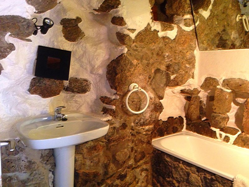 A small bathroom, kept very much in „Lanzarote – style“ with white, rounded walls and visible lava stones, rounds off the ambience.